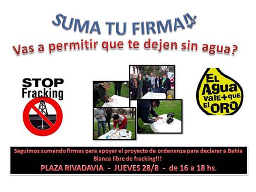 En primer lugar la campaña de firmas por lograr que BahÃa Blanca sea territorio libre de fracking mediante una ordenanza, que se está realizando y que cuenta con un enorme apoyo de la población y que difunde información seria y necesaria sobre esta cuestión.