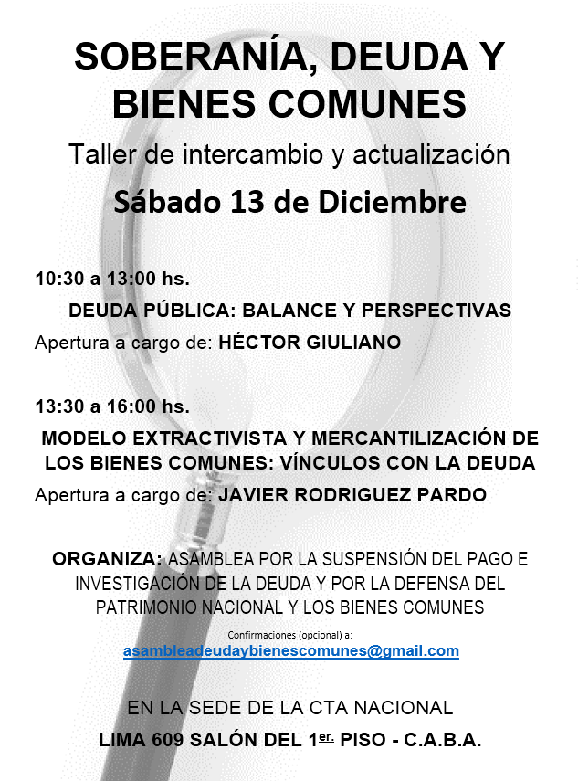 Desde la Corriente Nacional Emancipación Sur, invitamos a difundir y participar!. Taller de intercambio y actualización sobre la deuda y los bienes comunes. Sábado 13 de Diciembre, en Lima 609, primer piso, CABA. Taller
