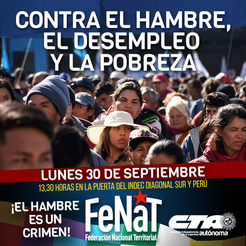 Contra el hambre, el desempleo y la pobreza, la Federación Nacional Territorial convoca el 30 de septiembre a las 13,30 horas frente al #INDEC, Diagonal Sur y Perú, CABA #ElHambreEsUnCrimen